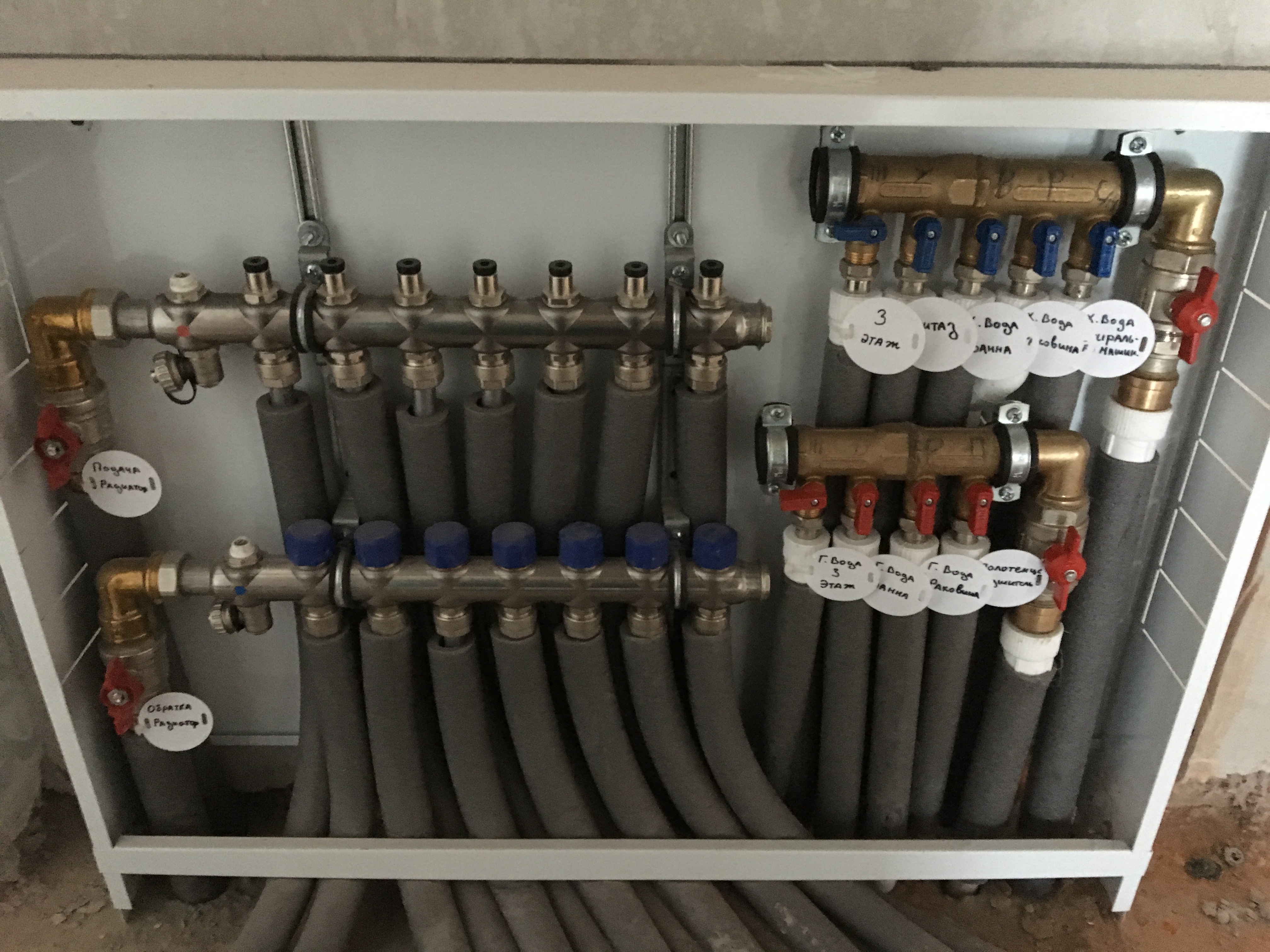 Распределительный коллектор состоит из 3-х насосный групп (две группы радиаторного отопления, одна группа теплого пола). С помощью комнатных терморегуляторов была установлена индивидуальная температура на каждом этаже. Радиаторы Kermi (Гемания). Материал трубопровода – сшитый полиэтилен фирмы Rehau.